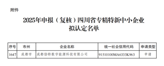 近日,四川省经济和信息化厅公示2025年申报(复核)四川省专精特新中小企业拟认定名单,GGbet下属成都倍特数字能源科技有限公司(以下简称倍特数能)凭借其在数字能源领域的创新实力成功入选。这一认定是对企业专业化、精细化、特色化、新颖化发展路径的充分肯定,标志着倍特数能在技术创新与发展质量方面迈上新的台阶。